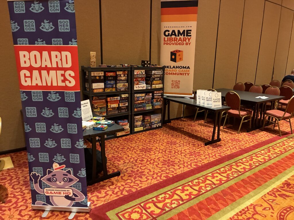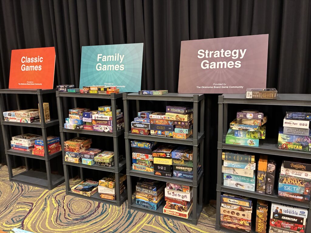 The Future Society of Central Oklahoma, a 501(c)3 charity that promotes arts, literature, and the sciences through the lens of pop culture, runs SoonerCon every June. At SoonerCon, the Oklahoma Board Game Community provides a library of free to play board games, plus volunteers to organize and help teach.
